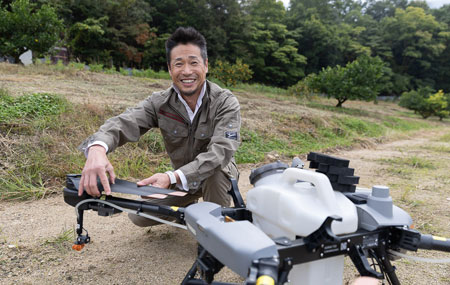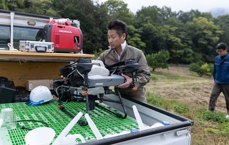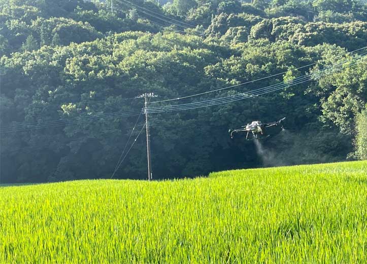 私たちは、地元・三豊の農家さんの負担を少しでも軽くできるよう、ドローンを使って農薬や肥料の散布を代行しています。